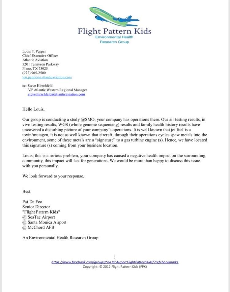 FPK is an environmental health advocacy group that has been studying the long term health impacts of aircraft operations, including operations at SMO. They are finding concrete evidence of toxins from the aircraft operations showing up in the air, the soil, and the bodies of people in the community. Testing has been done on hair, urine, DNA, soil, and air. The dangerous toxic metals and other substances are being found that have a unique “signature” traceable to the aircraft operations. FPK reached out to Atlantic Aviation earlier this week to discuss this important issue negatively impacting the long term health and environment of the local community.
